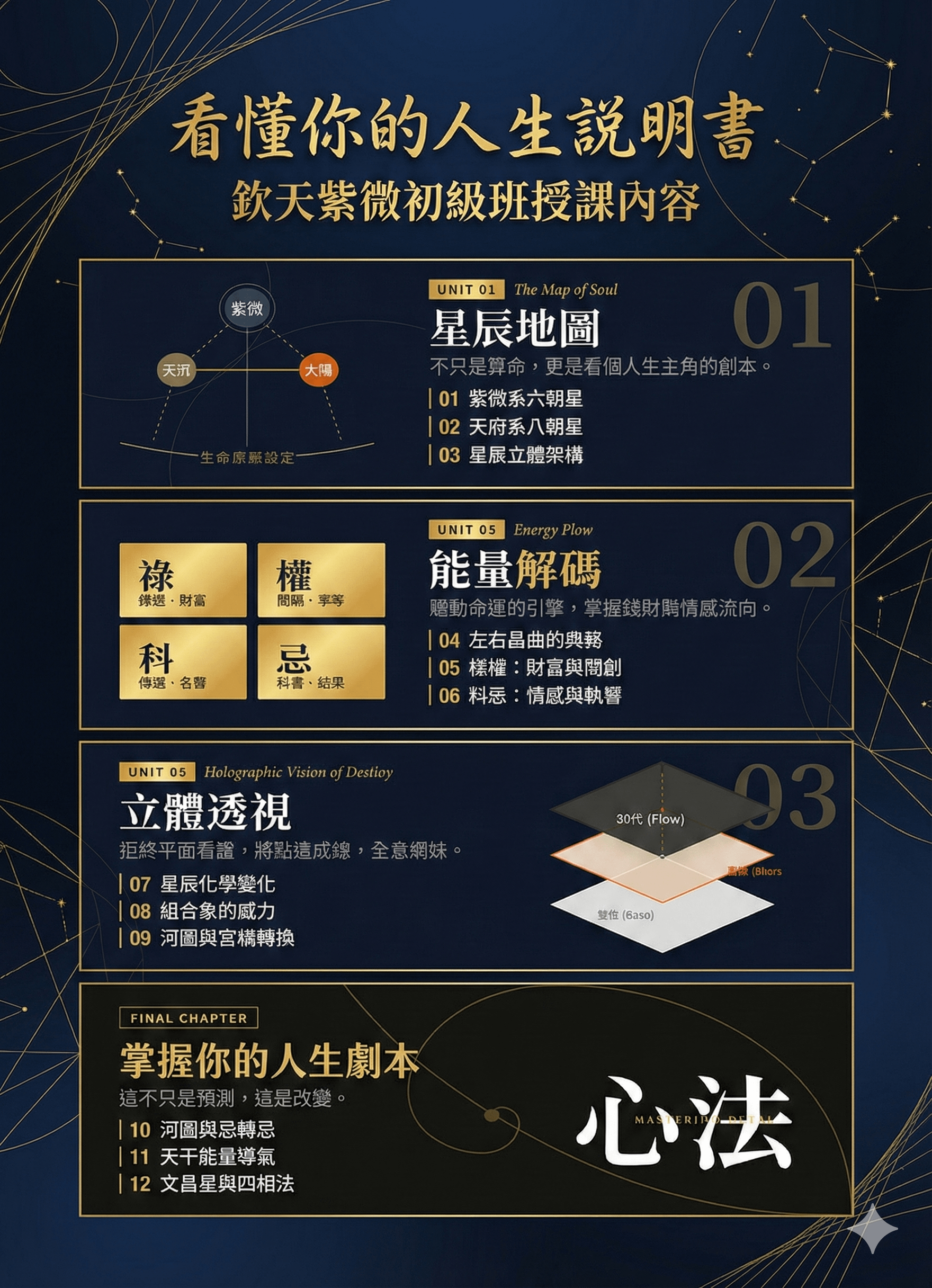探討生命的深層結構。左輔、右弼、文昌、文曲不僅是輔佐星,在欽天紫微中更是解開「三世因果」與「業力」的密碼。本課程將帶您進入紫微斗數的高階心法,透視命運背後的隱形推手。